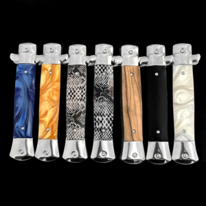 Das OTF Marbled Stiletto Automatic Knife ist mit einer Gesamtlänge von 23 cm oder 28 cm zweifellos ein echter Hingucker. Das Stilettomesser verfügt über eine spiegelpolierte, 9,5 cm lange Klinge aus rostfreiem Stahl mit rasiermesserscharfer Schneide und Durchdringungsspitze. Die Klinge springt beim Vorschieben des Abzugs aus der Vorderseite des Messers heraus und wird beim Zurückziehen wieder eingezogen. Das 10 cm oder 12,7 cm lange geschlossene Taschenmesser verfügt über klassische Griffschalen, und der Abzug befindet sich bequem oben. Das beeindruckende Stiletto-Taschenmesser lässt sich sicher in einem Nylon-Gürtelholster mit Schnellverschluss tragen.